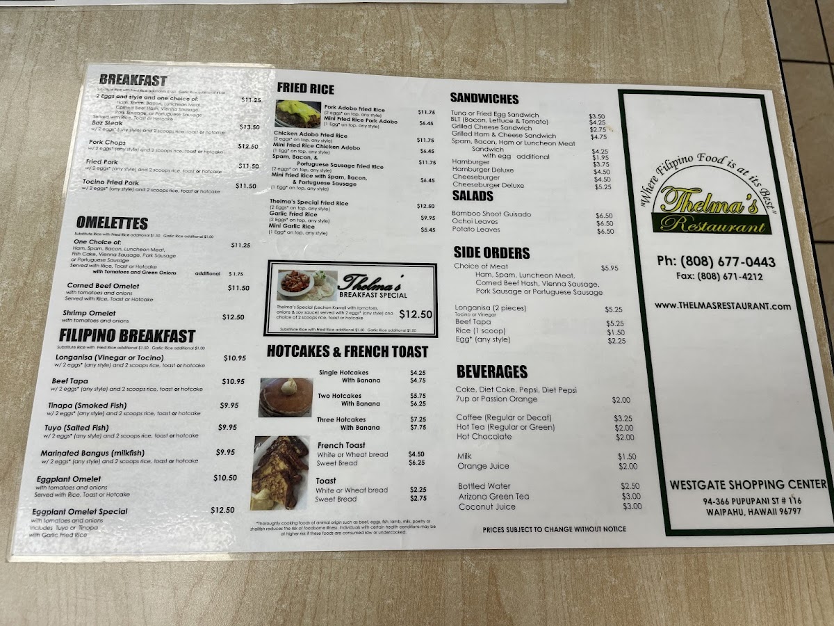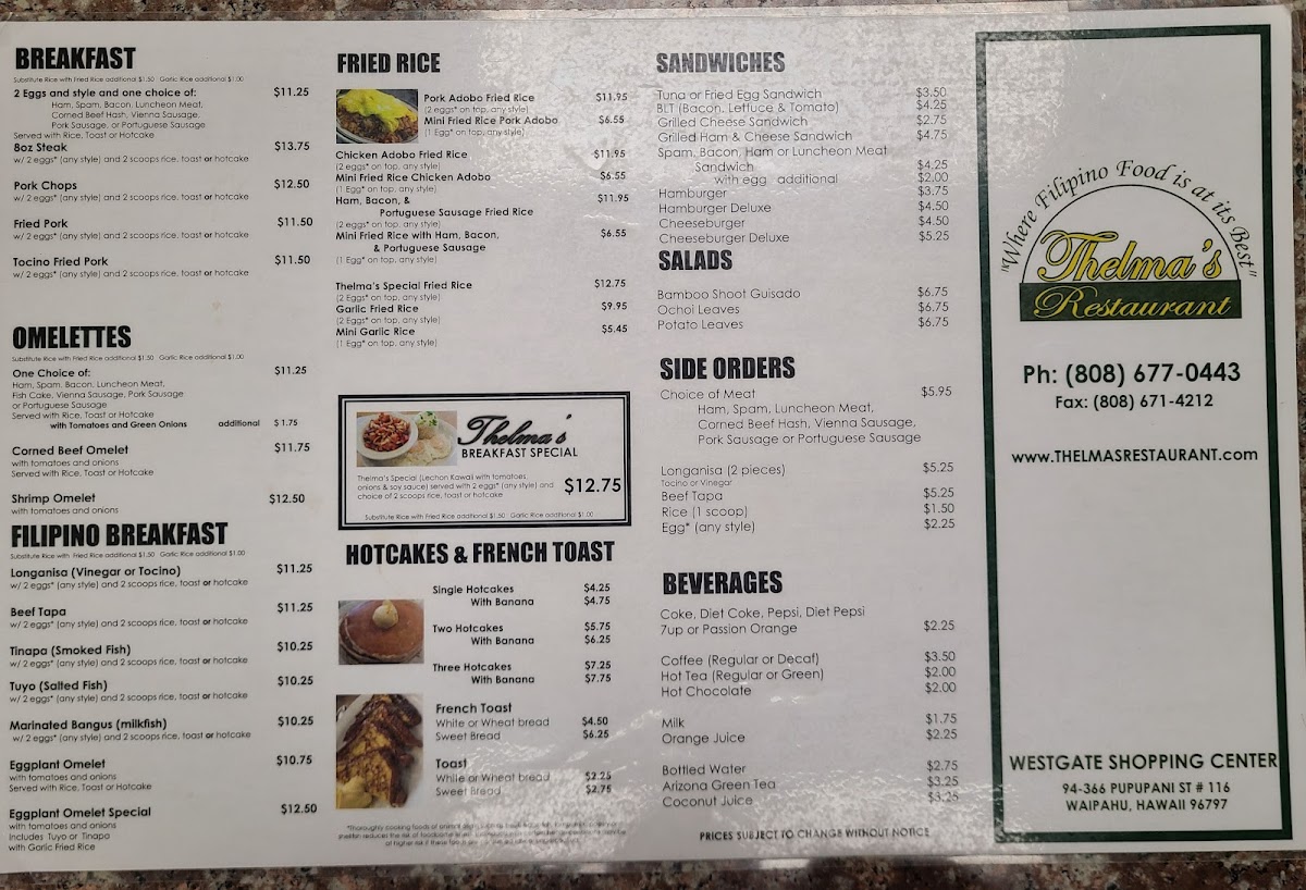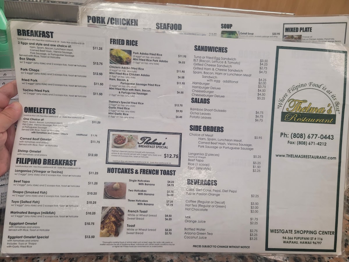 Welcome to Thelma's Restaurant, a delightful gem in Waipahu, HI, where authentic Filipino cuisine takes center stage. Nestled at 94-366 Pupupani St, this charming eatery serves up hearty meals for breakfast, lunch, and dinner, catering to every craving.
